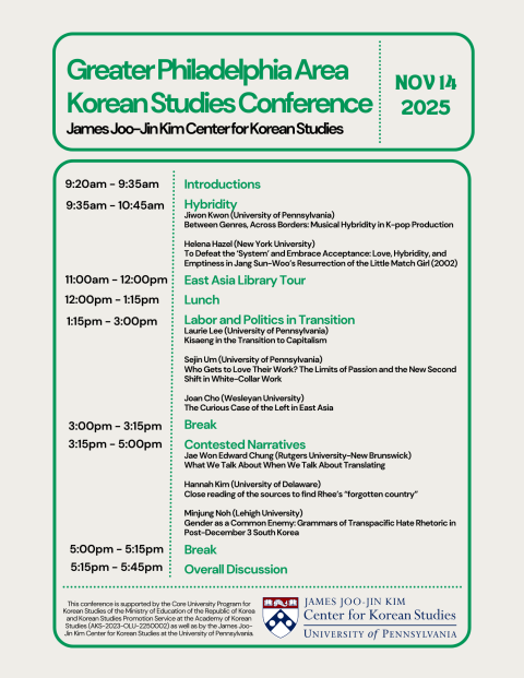 This conference is supported by the Core University Program for Korean Studies of the Ministry of Education of the Republic of Korea and Korean Studies Promotion Service at the Academy of Korean Studies (AKS-2023-OLU-2250002) as well as by the James Joo-Jin Kim Center for Korean Studies at the University of Pennsylvania.